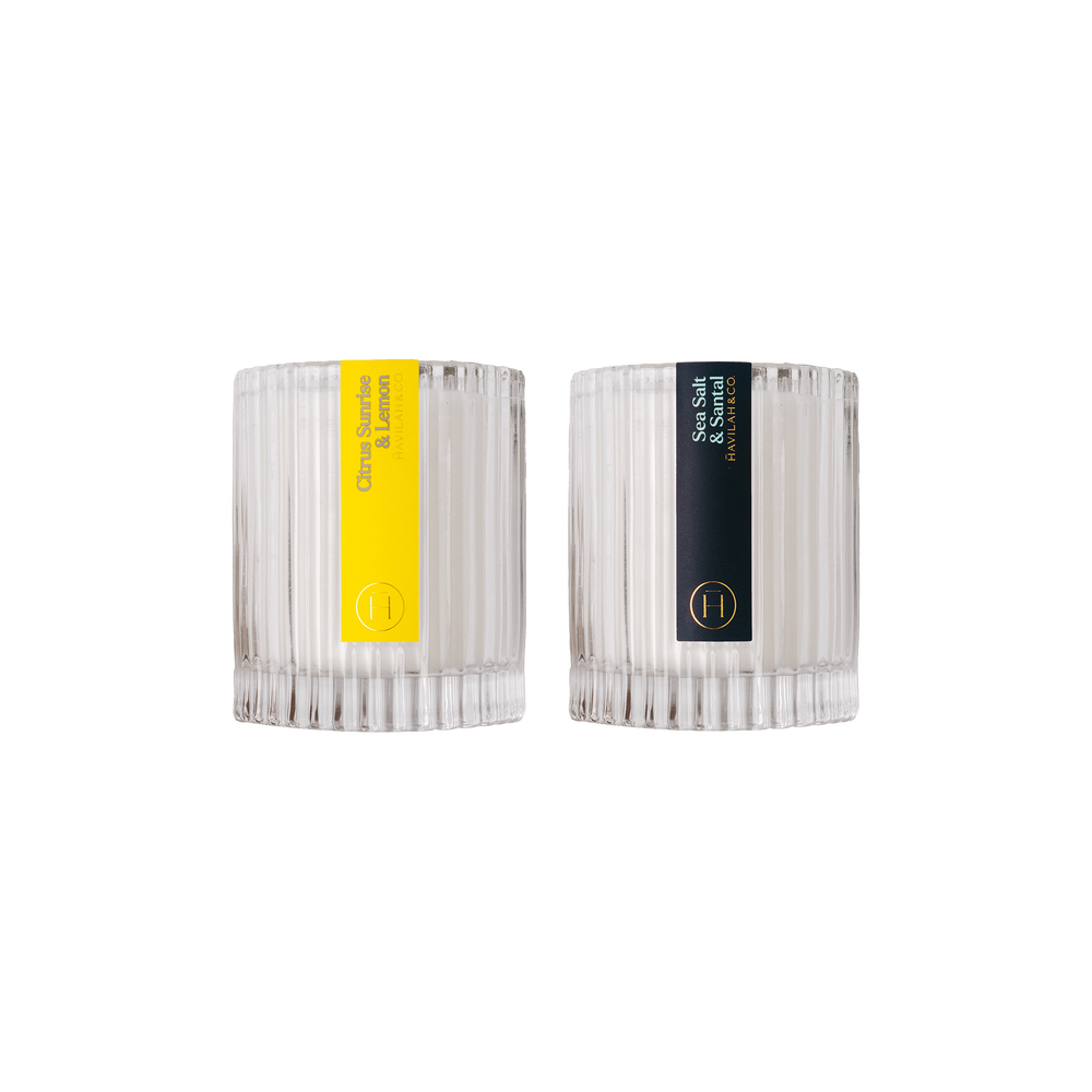 Perfect for your man, His Favorite Candle Duo: fresh Citrus Sunrise & Lemon (1) paired with soothing Sea Salt & Santal (1) for a refreshing, relaxing ambiance.