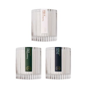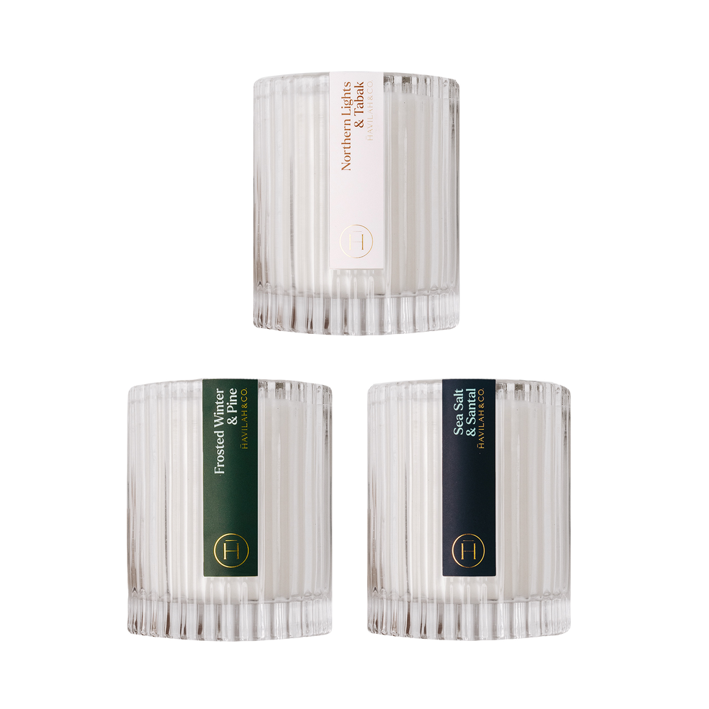 Experience the great outdoors from your home with this adventurous trio, featuring the warm leather and smoke of Northern Lights & Tabak, the crisp pine forest of Frosted Winter & Pine, and the refreshing coastal breeze of Sea Salt & Santal.
